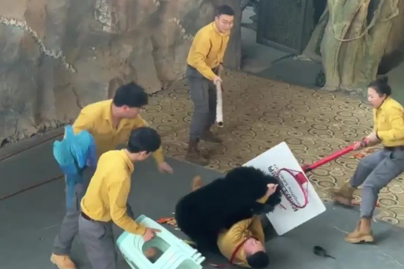 Beberapa video kejadian yang tular di media sosial menunjukkan detik cemas ketika penjaga berkenaan bergelut untuk melepaskan diri sementara beruang itu terus menerkamnya.