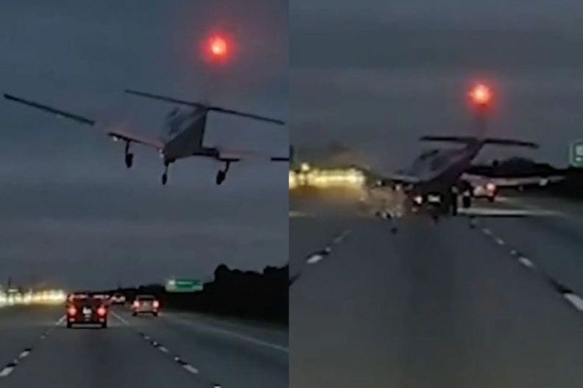 Pesawat itu turut dilihat menggelongsor sebelum berhenti selepas menghentam pembahagi jalan.