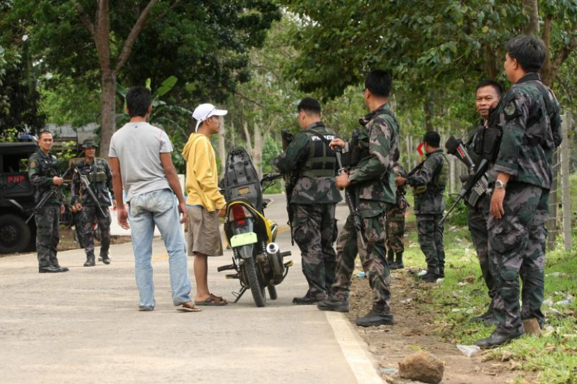 Pasukan polis Filipina melakukan pemeriksaan terhadap penunggang motosikal di Kampung Indanan, selatan Filipina selepas dua orang wanita diculik kumpulan lelaki bersenjata dipercayai kumpulan Abu Sayyaf. -foto EPA
