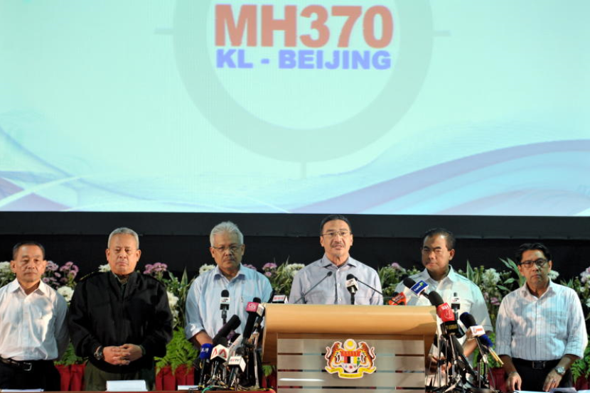 Hishammuddin (tiga, kanan) menjawab pertanyaan media pada sidang media mengenai perkembangan terkini pesawat MH370 di PWTC pada Sabtu. - fotoBERNAMA