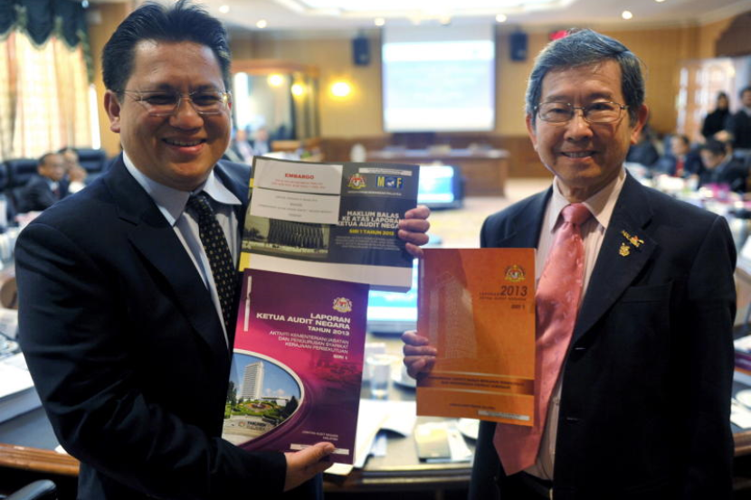 Nur Jazlan (kiri) bersama Naib Pengerusinya, Dr Tan Seng Giaw menunjukkan Laporan Ketua Audit Negara Tahun 2013 Siri 1 sebelum mempengerusikan taklimat berkaitan laporan berkenaan di Bangunan Parlimen pada Isnin.