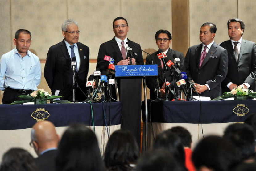 Pemangku Menteri Pengangkutan Datuk Seri Hishammuddin Tun Hussein (tiga, kiri) ketika sidang media mengenai perkembangan terkini kehilangan pesawat MAS MH 370 di Kuala Lumpur pada Isnin. Turut kelihatan Timbalan Menteri Pengangkutan Datuk Abdul Aziz Karpawi (dua, kanan), Timbalan Menteri Luar Datuk Hamzah Zainuddin (dua, kiri), Timbalan Menteri Pertahanan Datuk Abdul Rahim Bakri (kanan) Ketua Pengarah Jabatan Penerbangan Awam (DCA) Datuk Azharuddin Abdul Rahman (tiga, kanan) dan Ketua Pegawai Operasi Malaysia Airlines (MAS), Ahmad Jauhari Yahya (kiri). -fotoBERNAMA