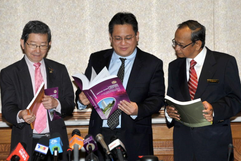 Pengerusi Jawatankuasa Kira-Kira Wang Negara (PAC), Datuk Nur Jazlan Mohamed (tengah) bersama Ketua Audit Negara, Tan Sri Ambrin Buang (kanan) melihat Laporan Ketua Audit Negara Tahun 2013 Siri 1 selepas Mesyuarat PAC dan Pembentangan Laporan Ketua Audit Negara tersebut di Bangunan Parlimen di pada Isnin. Turut hadir Naib Pengerusi PAC, Dr Tan Seng Giaw. -fotoBERNAMA