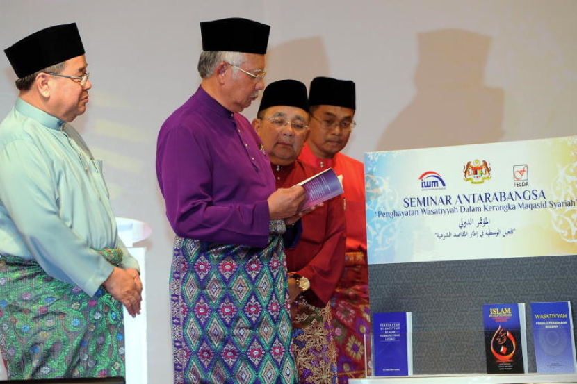 Najib melihat dari dekat buku terbitan Institut Wasatiyyah Malaysia dan Persatuan Generasi Bestari ketika merasmikan Seminar Antarabangsa 'Penghayatan Wasatiyyah Dalam Kerangka Maqasid Syariah' di Menara Felda di Kuala Lumpur, malam Selasa. Turut hadir Mohd Isa (tiga, kiri) dan Dr Abdullah (kiri). Foto BERNAMA