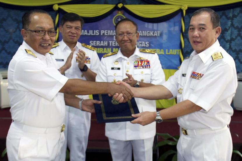 Panglima Tentera Laut, Laksamana Tan Sri Abdul Aziz Jaafar (dua, kanan) menyaksikan majlis pemakaian pangkat dan serah tugas Asisten Ketua Staf Pentadbiran Laksamana Pertama Datuk Wah Yuen Mei (kanan) kepada Pemangku Laksamana Pertama Azhari Abdul Aziz (kiri) pada majlis pemakaian pangkat dan serah tugas oleh Panglima Tentera Laut di KD Sri Gombak di Kuala Lumpur, Selasa.