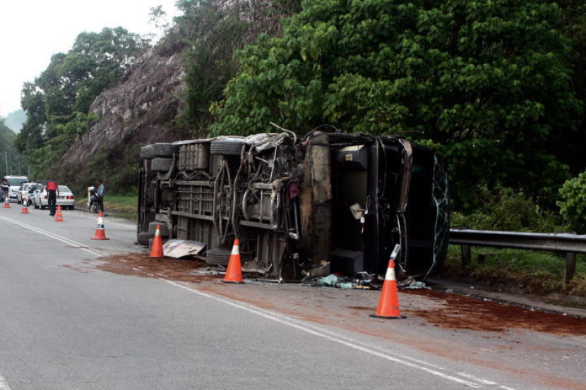 TERBALIK... Keadaan bas yang terlibat dalam kemalangan di KM11 Jalan Bentong-Raub dekat Bilut di sini, awal pagi Sabtu. -Foto BERNAMA.