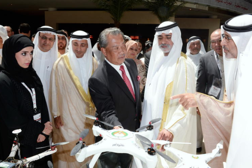 Tan Sri Muhyiddin Yassin bersama Menteri Pembangunan Kebudayaan, Belia dan Sosial Emiriyah Arab Bersatu (UAE), Sheikh Nahyan Mubarak Al Nahyan (dua, kanan) tertarik melihat alat kawalan jauh sewaktu melawat pameran Pendidikan dan Latihan Teluk (GETEX) 2014 di Pusat Konvensyen dan Pameran Antarabangsa Dubai (DICEC) baru-baru ini.