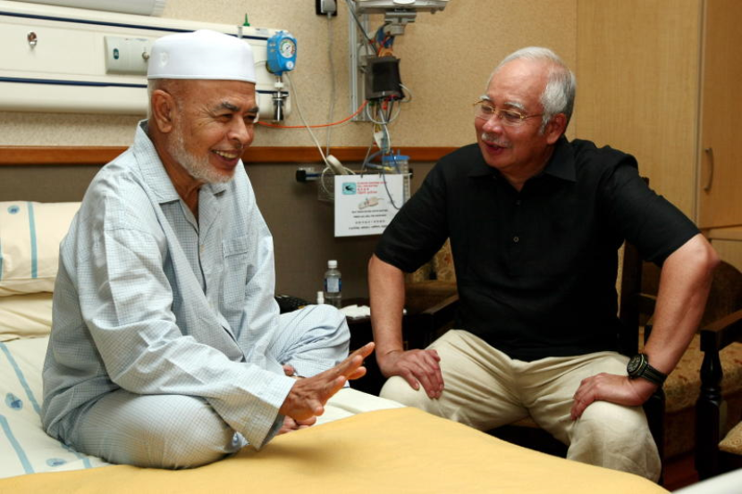 MESRA... Perdana Menteri, Datuk Seri Najib Tun Razak berbual mesra bersama Timbalan Mursyidul Am PAS, Datuk Dr Haron Din (kiri) yang kelihatan ceria dan semakin sihat semasa kunjungan Perdana Menteri ke Institut Jantung Negara (IJN) pada Sabtu. -fotoBERNAMA
