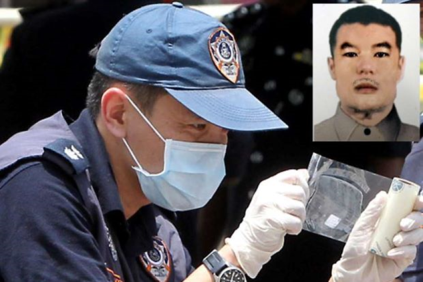 Seorang pegawai penyiasat mengumpul bukti ditempat kejadian tembakan berlaku. Gambar kecil, fotofit suspek yang menembak dua anggota polis di Pandan Indah.