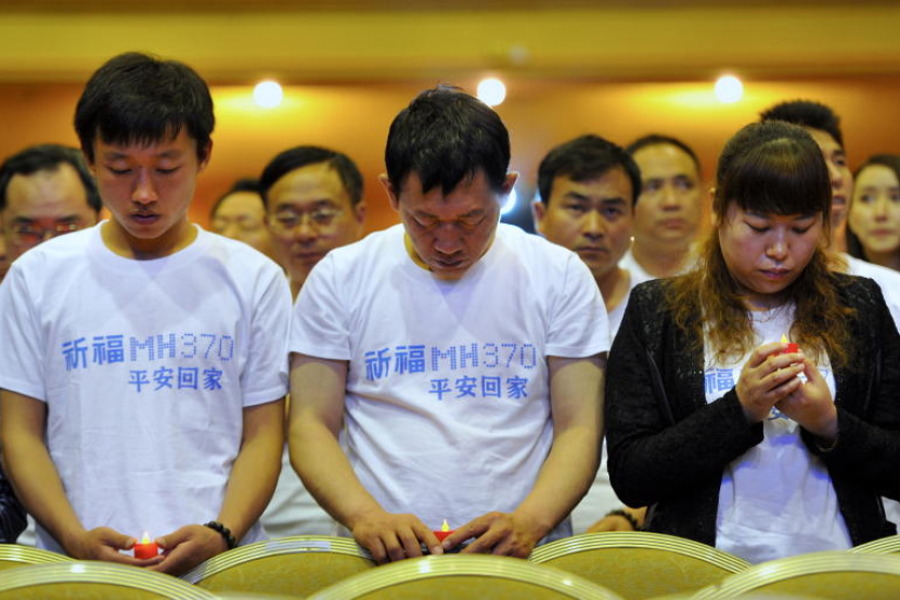 Keluarga mangsa pesawat MH370 berdoa ketika upacara keagamaan bagi memperingati pesawat MH370 di Wisma MCA, Kuala Lumpur baru-baru ini.-fotoBERNAMA