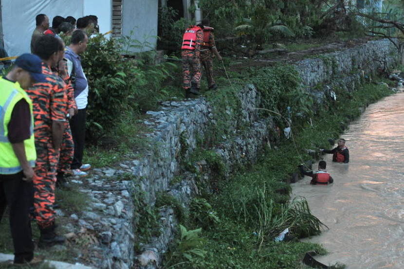 Anggota Bomba dan Penyelamat meneruskan operasi mencari mangsa lemas, Khairul Azril yang dipercayai hanyut selepas tergelincir ke dalam longkang, Rabu.
