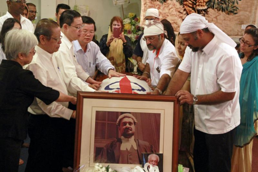 Beberapa pemimpin DAP menutup keranda Karpal menggunakan bendera parti itu. - Foto LIM BENG TATT/The Star