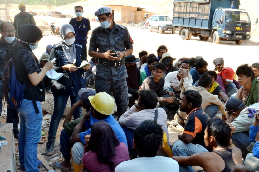 Anggota Imigresen Melaka memeriksa dokumen perjalanan buruh binaan yang ditahan dalam operasi bersepadu 6P di tapak pembinaan di Mukim Ayer Panas , Jasin, Khamis.