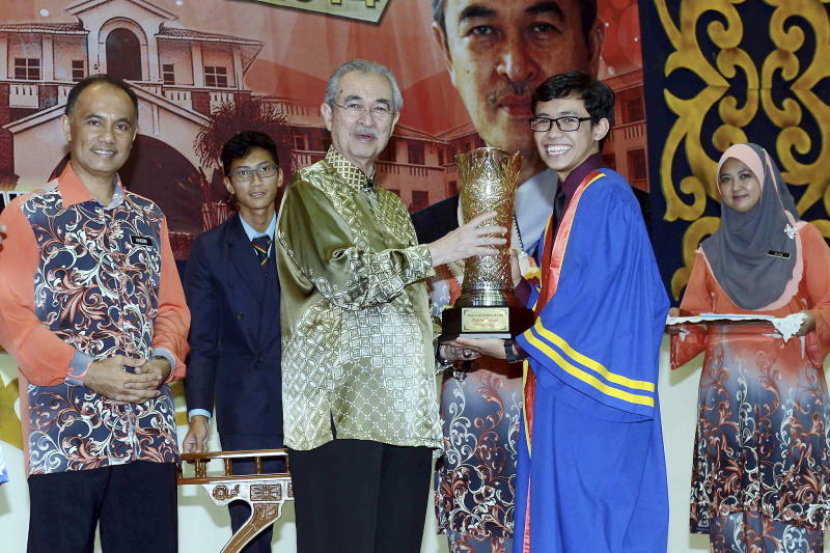 Bekas Perdana Menteri, Tun Abdullah Ahmad Badawi menyampaikan Anugerah Pelajar Terbaik Keseluruhan 2013 kepada Iqbal Danial Sa'id pada Majlis Anugerah Cemerlang Sekolah Sultan Alam Shah (SAS) 2014 di Putrajaya pada Sabtu.Turut sama Pengetua Cemerlang Sekolah SAS, Haidzir Hussin (kiri). -Foto BERNAMA.