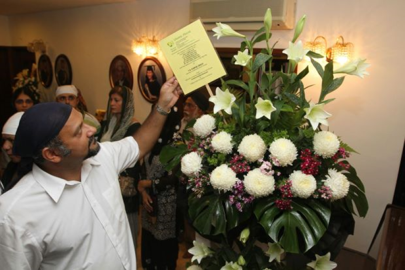 Gobind memerhatikan bunga yang dihantar Perdana Menteri Datuk Seri Najib Tun Razak di atas kematian bapanya dalam satu kemalangan di kediamannya di Jalan Utama, George Town, Pulau Pinang pada Sabtu.
