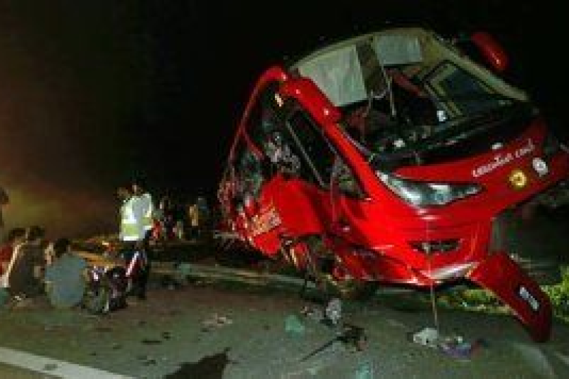 Keadaan bas ekspres yang terlibat dalam kemalangan di Kilometer 111 Lebuhraya Pantai Timur (LPT) menghala ke Kuala Lumpur, awal pagi Sabtu.