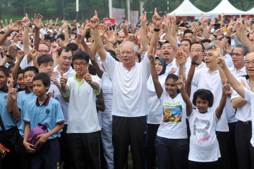 Najib (tengah) melakukan senamrobik bersama orang ramai sebelum memulakan Larian yang bertemakan "Hapuskan Rasuah, Jangan Beri Jangan Terima" di Padang Merbok, Kuala Lumpur pada Ahad. Foto BERNAMA