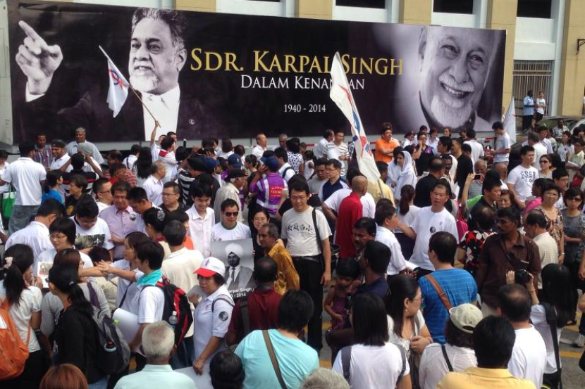 Orang ramai mengemuruni di hadapan sepanduk gergasi 'Karpal Singh Dalam Kenangan' di Dewan Sri Pinang selepas memberi penghormatan terakhir kepada mendiang Karpal Singh. Foto LIM BENG TATT