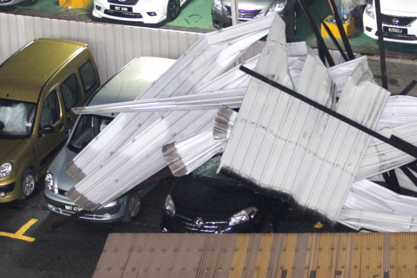 Keadaan kereta yang dihempap bumbung yang diterbangkan angin kencang daripada kawasan perumahan berdekatan. -foto FAIHAN GHANI/ The Star