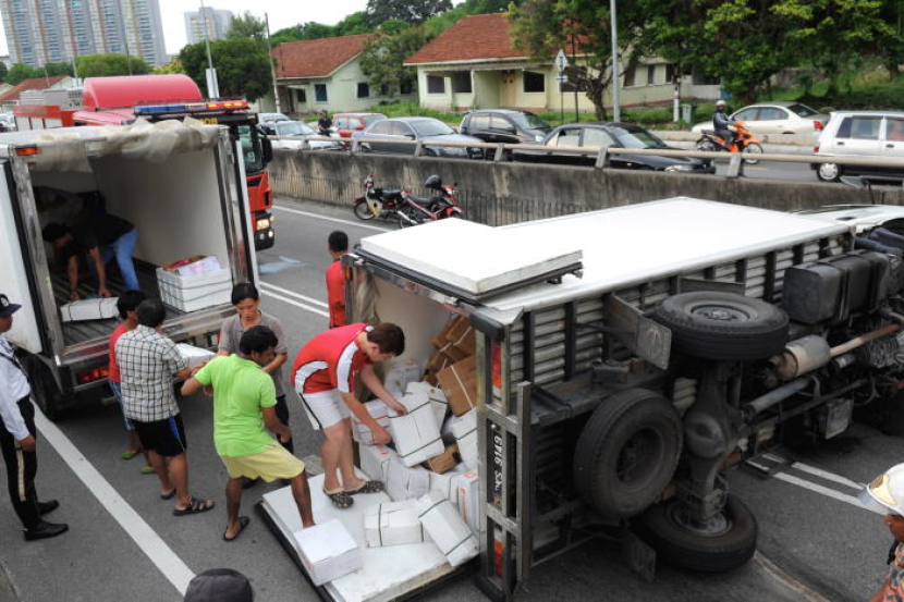 Beberapa pekerja mengeluarkan kotak-kotak yang mengandungi makanan laut sejuk beku ke dalam sebuah lori apabila lori yang membawa muatan berkenaan terbalik selepas terbabas di terowong Jalan Udini di George Town, Rabu. -fotoBERNAMA