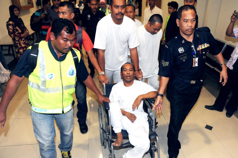Harun Mat Saat, 48,(duduk) dan lima pengikutnya dibicarakan selepas dituduh membunuh Ketua Penolong Penguat kuasa Jabatan Agama Islam Pahang (Jaip), Ahmad Raffli Abd Malek.