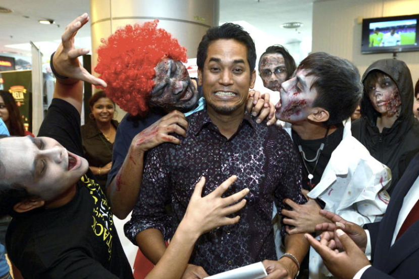 Khairy Jamaluddin disergah zombi ketika melawat tapak pameran Zombie Run sempena majlis pra pelancaran FEP 2014 di lobi Kementerian Belia dan Sukan, Khamis.