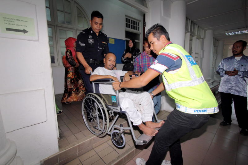 Anggota polis membantu ketua ajaran sesat Tuhan Harun, Harun Mat Saat, 48, (berkerusi roda) menuruni tangga selepas keluar dari kamar Mahkamah Rendah Syariah Kuantan setelah sebutan semula kes penyebaran ajaran sesat Tuhan Harun bersama enam pengikutnya, di Kuantan, Khamis. -fotoBERNAMA