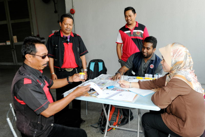 Pegawai AADK memberi penerangan kepada seorang bas ekspres mengenai ujian air kencing ketika mengadakan operasi di Hentian Putra di sini, Rabu.