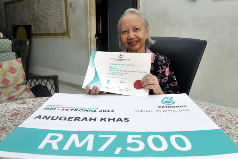 Wartawan veteran, Khalidah Adibah Amin, 78, menunjukkan sijil dan replika cek berjumlah RM7,500 yang dimenanginya dalam Anugerah Khas Institut Akhbar Malaysia (MPI)-Petronas 2013 di rumahnya di Kuala Lumpur pada Sabtu. Khalidah atau lebih dikenali dengan nama Adibah Amin tidak dapat hadir ke majlis penyampaian hadiah di majlis malam anugerah MPI 2013 yang berlansung baru-baru ini kerana mengalami masalah kesihatan. -fotoBERNAMA