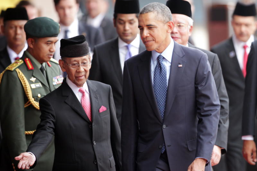 Yang Dipertuan Agong, Tuanku Abdul Halim Mu'adzam Shah mempersilakan Presiden Amerika Syarikat, Barack Obama ketika menyambut ketibaannya di Bangunan Parlimen pada Sabtu.
