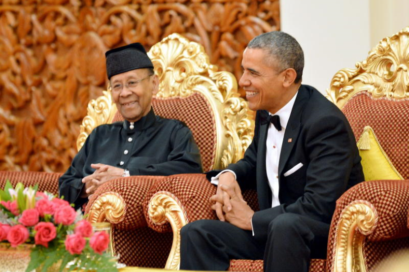 Yang di-Pertuan Agong Tuanku Abdul Halim Mu'adzam Shah bersama Presiden Amerika Syarikat Barack Obama pada Majlis Jamuan Negara Meraikan Presiden Amerika Syarikat ke Malaysia di Istana Negara pada malam Sabtu. -Foto BERNAMA.