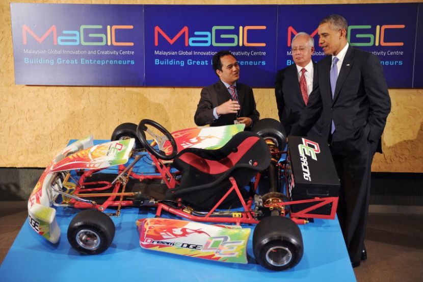Perdana Menteri Datuk Seri Najib Tun Razak dan Presiden Amerika Syarikat Barack Obama melihat go-kart elektrik hasil syarikat Dream Edge Racing sempena pelancaran Pusat Inovasi dan Kreatif Global Malaysia (MaGIC) di Cyberjaya pada Ahad. -Foto BERNAMA