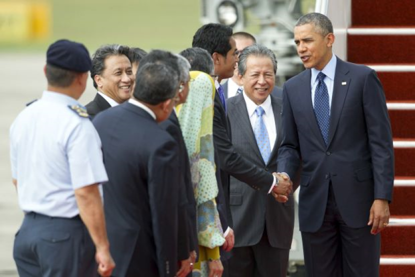 Khairy bersalaman dengan Obama di Pangkalan TUDM di Subang sambil diperhatikan oleh Menteri Luar, Datuk Seri Anifah Aman (dua, kanan). Foto BERNAMA