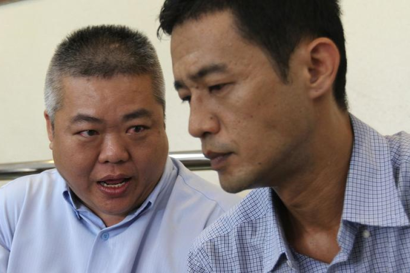 Pengerusi penaja Penang Front Party, Datuk Go Chui Tiong (kiri) berbincang sesuatu dengan jurucakap parti berkenaan, Saw Chong Tatt semasa mengadakan sidang akhbar mengenai penubuhan parti baru itu yang akan bertanding dalam pilihanraya kecil (PRK) Parlimen Bukit Gelugor pada 25 Mei ini.