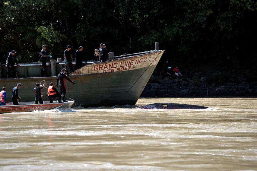 Kelihatan pasukan penyelamat cuba menarik keluar bot ekspres 'Kawan Mas' yang karam di Giam Bungan, Sungai Rajang, Belaga pada Mei tahun lalu.