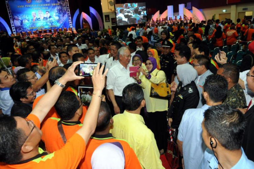 Penjawat awam mengambil kesempatan untuk bergambar dengan Perdana Menteri Datuk Seri Najib Tun Razak ketika sambutan Hari Pekerja di Dewan Wawasan Kubang Pasu, Jitra, Kedah pada Khamis. - G.C.TAN