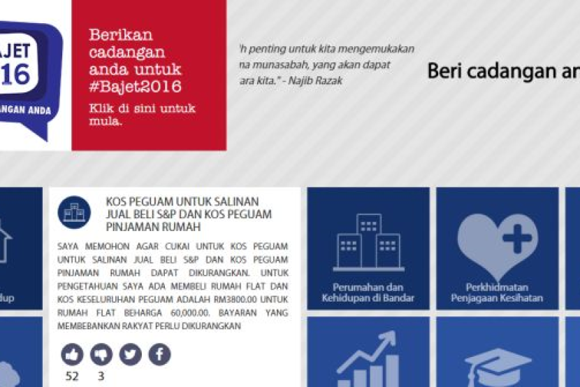 "Kemukakanlah sebanyak cadangan yang mungkin dalam laman mikro Bajet 2016 agar kita dapat bersama-sama membentuk masa depan negara," katanya.