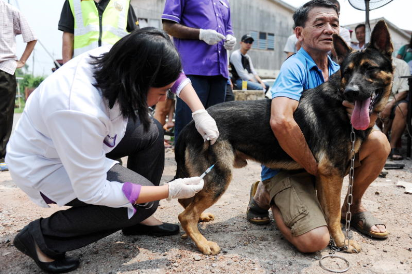 Pegawai Veterinar Alor Setar, Dr. Lee Chian Hoey (kiri) memberi suntikan vaksin kepada anjing pada sidang media mengenai kempen kesedaran anjing gila (rabies) pada Sabtu. Foto Bernama