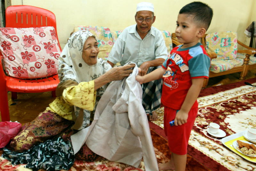 Ibu Shahidan Saad, Che Mun Puteh, 75, (duduk kiri) menunjukkan baju Allahyarham Shahidan Saad kepada cucunya Muhammad Afiq Amzar (kanan) ketika ditemui di rumahnya di Kampung Kodiang Lama Luar, Isnin. Turut memerhati bapa Shahidan, Saad Dogoi, 76. Jenazah Shahidan, 52, dan Abdul Habib Lahman, 68, dari Sik, Kedah, yang hilang selepas runtuhan kren di Masjidil Haram, 11 September lalu disahkan waris-waris mereka melalui pengecaman dan berdasarkan barangan peribadi termasuk gelang tangan dan lencana pengenalan diri. Ahli keluarga Shahidan yang ditemui melahirkan gembira dan syukur selepas jenazahnya telah ditemui dan akan dikebumikan di Makam Muaissem, Mina. -fotoBERNAMA