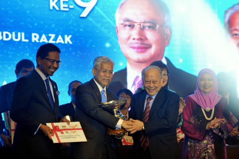 Menteri Pendidikan Tinggi Datuk Seri Idris Jusoh menyampaikan anugerah Tokoh Akademik Negara Ke-9 kepada Prof Emiritus Tan Sri Dr Augustine Ong Soon Hock (USM) di Putrajaya, Isnin. Anugerah berupa wang tunai RM200,000, sebuah piala dan sijil penghargaan sebagai menghargai sumbangan Augustine Ong dalam bidang kimia dan teknologi minyak sawit. - fotoBERNAMA