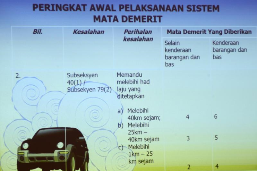 Bagi kesalahan memandu melebihi had laju yang ditetapkan, pemandu kenderaan persendirian akan diberi empat mata (melebihi 40km sejam) manakala bagi pemandu kenderaan barangan dan bas pula ialah enam mata, katanya.