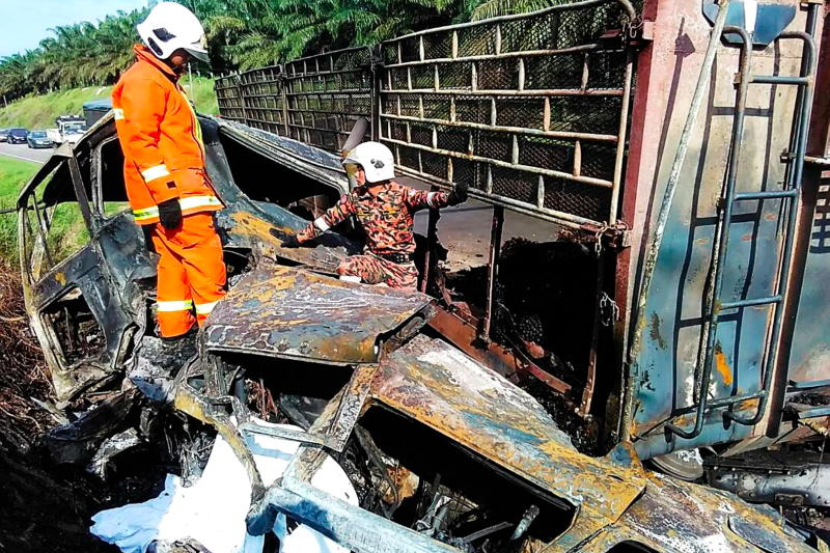 Keadaan kenderaan yang terlibat dalam kemalangan ngeri sehingga mengakibatkan tujuh maut termasuk lima rentung di Ladang Risda Palong. - Bernama