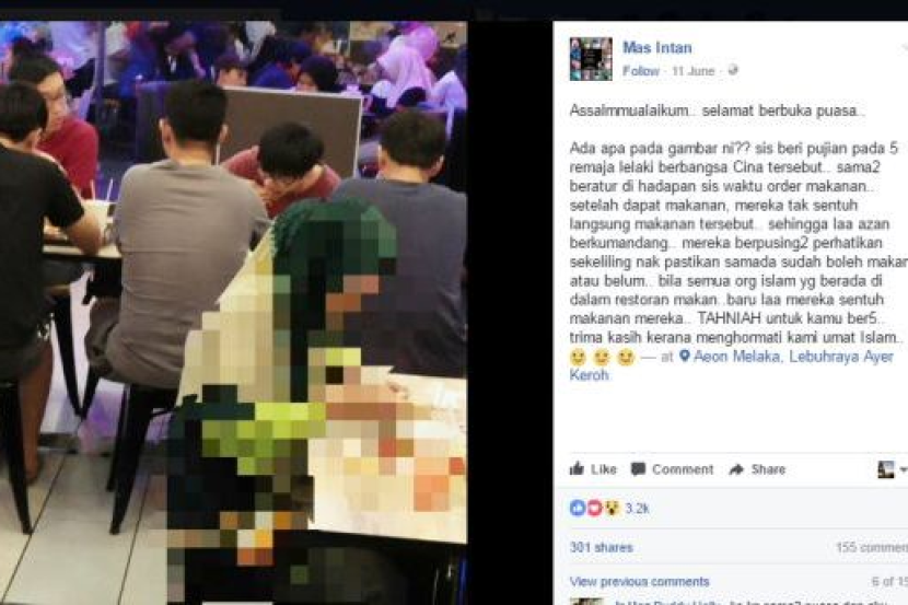 Menurut Mas Intan, kelima-lima pemuda Cina terbabit hanya menjamu makanan mereka sebaik sahaja semua pelanggan beragama Islam di dalam restoran yang sama menjamah juadah iftar.