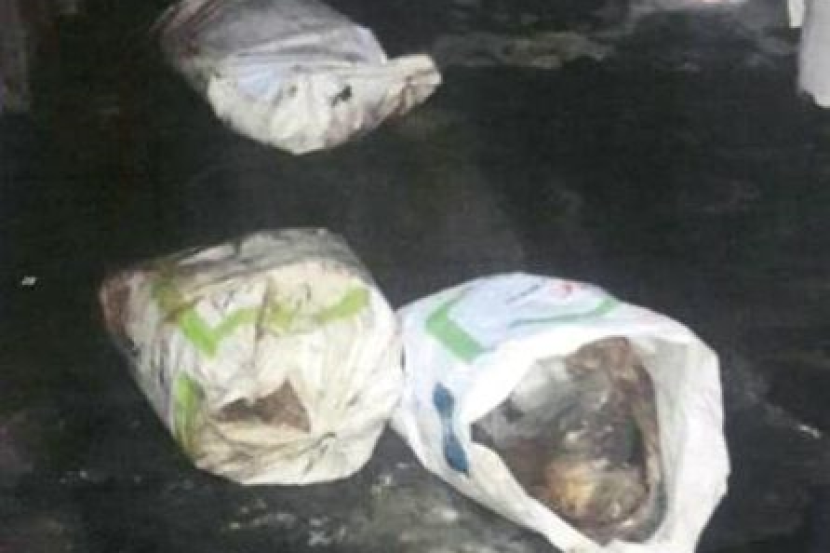 Pemeriksaan lanjut di bahagian bawah kabinet dapur itu menemukan tiga bungkusan guni plastik yang diikat yang mengandungi badan manusia yang telah dipotong-potong dengan menggunakan senjata tajam.