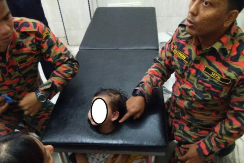 IPOH: Kepala seorang budak perempuan berusia tiga tahun tersekat di lubang muka sebuah katil salon kecantikan di Jalan Temenggong, Pasir Puteh di sini.