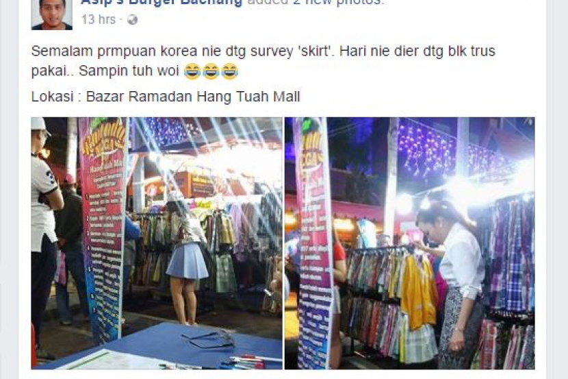 PETALING JAYA: "Dia datang memang dalam keadaan terujalah, dia punya 'excited' pun lain macam," kata Asiff Amiz tentang kisah tular seorang wanita Korea yang telah membeli 'skirt sampin' di Bazar Ramadan Mega 2017 Hang Tuah Mall, Melaka. Asiff, 29, atau lebih senang disapa Asip menceritakan semula bagaimana dia dan rakan-rakan terpegun melihat wanita berkenaan begitu berminat dengan kain sampin yang dijual di salah sebuah kedai di bazar tersebut. Asip berkata, dia bagaimanapun tidak menyangka wanita berkenaan, yang datang bersama suami dan dua anaknya lebih berminat untuk memakainya sebagai skirt. "Dua hari lepas (Selasa) dia datang pakai skirt kembang, memang datang dalam keadaan terujalah, dia belek sampin tu satu-satu. "Bila tuan kedai tu datang, 'member' dah garu kepala macam mana nak 'explain' kepada wanita itu yang berulang kali angkat...letak sampin tu, macam nak tanya sesuatu," katanya kepada mStar Online, Khamis. Asip yang merupakan salah seorang urusetia di bazar itu dan kebetulan berada di kedai berkenaan hanya melihat gelagat kedua-dua mereka dari jauh, tetapi sempat merakamkan gambar wanita warga asing itu. Katanya, daripada pemerhatiannya, dia menjangkakan pelanggan berkenaan mempunyai masalah untuk berkomunikasi dengan warga tempatan. Asip turut rasa terkejut apabila wanita yang sama datang ke kedai itu sekali lagi pada malam berikutnya, kira-kira pukul 10 malam. "Semalam (Rabu) dia datang balik pakai seluar pendek, sebab itulah dia boleh sarung terus, sampin tu ada getah, bukan jenis lipat. "Memang 'kena' pula dia pakai, mungkin sebab dia cantik kot. Dia masukkan baju dalam sampin, memang sesuai, saya rasa tak ada orang boleh fikir buat macam tu," katanya. Menurut Asid, suaminya sempat singgah ke khemah urusetia di sebelah kedai tersebut apabila menyedari isterinya menjadi perhatian. "Dia cuba cakap tapi kami tak faham. Yang kami tahu dia cakap 'good...good' saja bila dia perasan kami ambil gambar isterinya, dia pun nampak suka dengan 'skirt' isterinya," katanya. Asip berkata, beliau dan rakan-rakan tidak pasti sama ada wanita tersebut memang sengaja mahu membuat kelainan dengan menjadikan sampin sebagai skirt, atau benar-benar tidak tahu bahawa sampin adalah pakaian tradisional kaum lelaki di negara ini. "Mungkin juga dia nampak benda tu cantik dan boleh pakai macam skirt dia terus berkenan. Mungkin juga bagi dia harganya murah, kita tak tahu apa yang difikirkan. "Bagi kami yang melihat, memang terpegun habis sebab 'kepala' dia lain macam, kita pun tak terfikir benda tu boleh jadi skirt, sebab songket, kita selama ni nampak benda tu sampin saja," katanya. Posting gambar yang dimuat naik oleh Asip telah menjadi tular di media sosial dan mendapat reaksi positif daripada netizen. Rata-rata memuji wanita berkenaan kerana kreatif dalam berfesyen.
