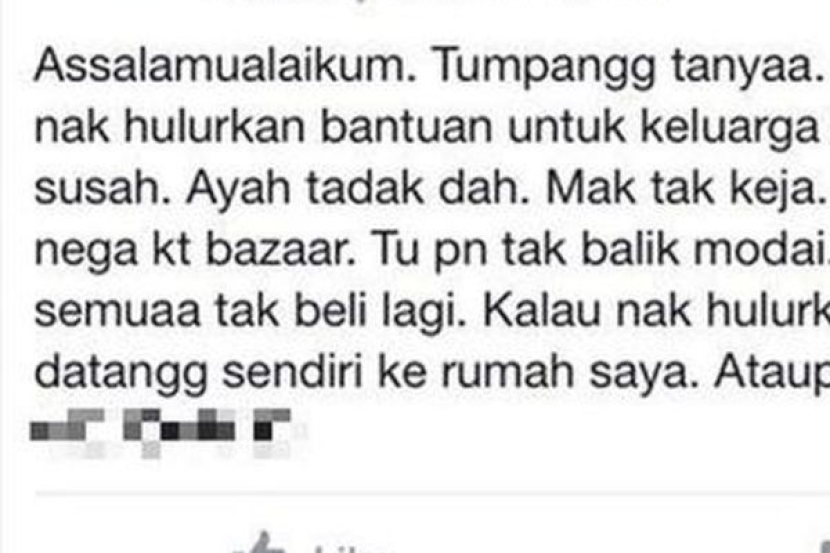 PETALING JAYA: Seorang gadis terkedu apabila satu posting merayu bantuan Aidilfitri untuk keluarganya telah dibalas dengan kecaman dan kata-kata kesat. Normasmira Zulkifli, 17, telah meminta jasa baik orang ramai yang sudi menghulurkan bantuan Hari Raya kepada keluarganya yang didakwa serba kekurangan, di Facebook (Kumpulan Penduduk Sungai Petani Kedah), kurang 10 hari sebelum sambutan Aidilfitri. Bagaimanapun, posting yang dimuat naik kira-kira pukul 3 petang Khamis itu menerima respons yang mengejutkan, menyebabkan dia terpaksa memadamnya pukul 5 pagi Jumaat. "Ramai hentam saya. Saya rasa sedih sangat. Bantuan tak dapat, sebaliknya depa kata saya macam-macam...depa kata saya pemalas, depa mencarut kat saya. "Saya rasa malu sangat, saya menangis baca komen-komen. Saya beritahu emak, emak kata 'biarlah apa depa nak kata, kami bukan mencuri...cuma minta tolong'," katanya kepada mStar Online, Jumaat. Normasmira, atau lebih senang dipanggil Ira berkata dia terpaksa menggunakan Facebook untuk mendapatkan bantuan kerana keluarganya belum membuat sebarang persiapan raya. "Duit sekupang pun tak ada, macam mana nak raya," katanya yang tinggal bersama enam ahli keluarganya yang lain di sebuah rumah tumpang di Padang Temusu, Sungai Petani. Berikut adalah paparan skrin penuh posting yang telah dimuat naik Ira. Ira bagaimanapun tidak keseorangan dalam berdepan kecaman kerana ada juga netizen yang bersimpati dengannya dan memberi nasihat dan kata-kata semangat kepadanya. Malah, dia juga mengakui menerima beberapa panggilan daripada orang tidak dikenali yang berjanji untuk menghulurkan bantuan walaupun posting itu yang mendapat hampir 2,000 komen telah dipadam. Bercerita lanjut, Ira berkata dia sudah berhenti sekolah tahun lepas kerana kesempitan hidup. Katanya, ibunya tidak bekerja selepas terbabit kemalangan pada 2008, tahun yang sama bapanya meninggal dunia akibat sakit jantung. Dia menambah, tahun 2008 jugalah dia disahkan menghidap penyakit Talasemia. "Sejak itu kakak saya yang sara keluarga, dia buat macam-macam kerja. "Sekarang dia berniaga air di bazar Ramadan, dapatlah RM20 hingga RM30 sehari...duit itulah buat beli beras dan lauk kami," katanya. Ira berkata ini adalah kali pertama dia meminta bantuan orang ramai di media sosial, tetapi mengakui pernah bertanya tentang kerja kosong di Facebook. Ira berkata sebelum ini dia bekerja di sebuah kedai makan, tetapi kedai itu telah ditutup. Menurut Ira, dia kini tinggal di sebuah rumah tumpang bersama ibu, abang, kakak, adik dan dua anak saudara. "Sekarang hanya adik dan dua anak saudara saja yang bersekolah. Abang tak bekerja, dia buat hal sendiri," katanya.