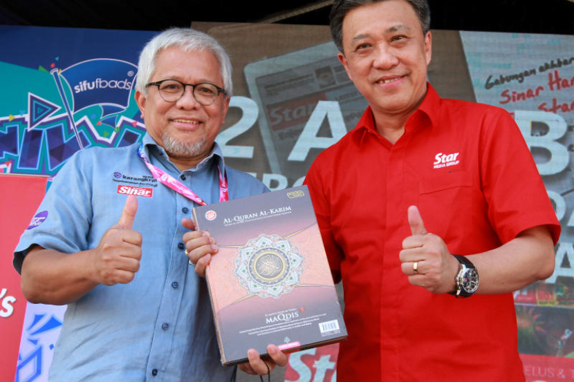 Ketua Pegawai Eksekutif Kumpulan Media Karangkraf (KMK) Datuk Dr Hussamuddin Yaacub menyampaikan cenderahati senaskhah terjemahan al_quran kepada Chun Wai (kanan) baru-baru ini.
