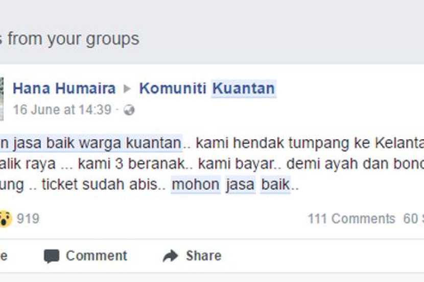 PETALING JAYA: Hasrat tiga beranak untuk merasai kemeriahan menyambut Syawal di kampung, akhirnya tertunai apabila ada pihak yang sudi membantu menumpangkan mereka. Menariknya, bantuan itu ditawarkan oleh seorang rakan lama yang terputus hubungan selama beberapa tahun selepas membaca kisah Mohd Azhar Abdullah, 32, dan isteri Hajar Azmi, 29, bersama anak perempuan mereka, Nur Hana Humaira, sembilan bulan, yang disiarkan mStar Online pada petang Ahad. Hajar berkata, sejak berita mengenai mereka disiarkan, mereka dihubungi ramai pihak selain dihujani pelbagai mesej yang menawarkan bantuan. "Seorang bekas rakan sekolah menengah menghubungi saya di Facebook menawarkan bantuan untuk menumpangkan kami sekeluarga balik ke Pasir Puteh. "Secara kebetulan rakan saya yang kini menetap di Kuantan bersama suami dan anak-anaknya juga mahu pulang ke kampung di Pasir Puteh untuk menyambut hari raya. Alhamdulillah, rezeki kami sekeluarga," katanya ketika dihubungi mStar Online. Pada Ahad, mStar Online melaporkan sebuah keluarga terpaksa meminta bantuan kepada orang ramai kerana kekangan kewangan, selain keadaan isteri seorang Orang Kelainan Upaya (OKU) dan anak masih kecil. Kesusahan tiga beranak ini akhirnya mendapat perhatian seorang rakan lama. Ia susulan 'posting' mereka di Facebook 'Hana Humaira’ pada Jumaat lalu yang menyebut: "Mohon jasa baik warga Kuantan, kami hendak tumpang ke Kelantan, nak balik raya. Kami tiga beranak. Kami bayar. Demi ayah dan bonda di kampung. Tiket sudah habis. Mohon jasa baik.” Hajar berkata, berita gembira itu bukan sahaja membolehkan mereka sekeluarga menyambut hari raya kali ini di kampung, malah dapat bertemu kembali rakan lama yang dikenali kira-kira 15 tahun lalu. Sehubungan itu, dia mengucapkan terima kasih kepada semua rakyat Malaysia yang prihatin dan sentiasa mendoakan kesejahteraan mereka. "Alhamdulillah, masalah kami dapat diselesaikan. Terima kasih kepada semua yang prihatin. Hanya Tuhan yang dapat membalas budi anda semua. "InsyaAllah, kami akan pulang ke kampung di Kg Kubang Bulat di Pasir Puteh pada Jumaat ini. Doakan keselamatan kami dan segala urusan dipermudahkan," katanya dengan nada ceria. Terdahulu, Mohd Azhar yang bekerja memotong rumput dan membantu katering dengan upah antara RM500 sehingga RM700 sebulan berkata, mereka bukanlah meraih simpati orang ramai untuk mendapatkan bantuan kewangan. “Saya tidak mahu orang ramai salah faham. Saya bukan nak duit tetapi hanya tumpangkan kami. Apa cara bantuan pun, biarlah kos tersebut ditanggung sendiri oleh penyumbang dan bukannya wang disalurkan kepada kami. "Kalau kami terpaksa tumpang tiga beranak duduk di belakang lori pun kami sanggup asalkan dapat pulang berhari raya sebab dah janji dengan keluarga,” kata Mohd Azhar.