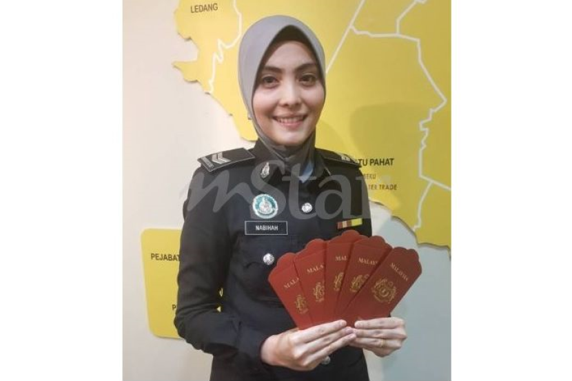 Seorang kakitangan Jabatan Imigresen Johor memegang beberapa sampul duit raya 'pasport Malaysia'. Foto ihsan Jabatan Imigresen Johor
